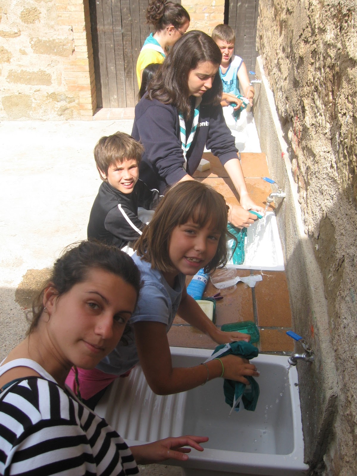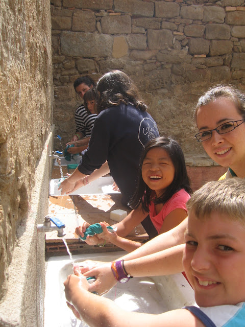 Aquest matí, els petits s’han llevat a la casa de colònies amb tota normalitat. Ha vingut a visiar-nos l’Àvia Cardener. Ens ha explicat que el que més li agadava de Vila Joval era trovar-se a les veïnes als safareijos del poble… així, hem decidit anar a rentar-nos els fulards… que ja tocaaaa! (em sembla recordar que eren blancs i verds… però no n’estic segur!!)